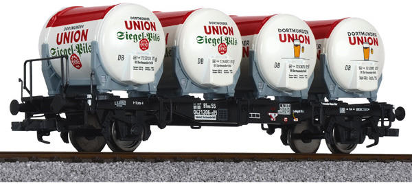 Liliput 235121 Tartályszállító pőrekocsi fékhíddal BTms 55, négy Ddikr 624 söröstartállyal DB IV